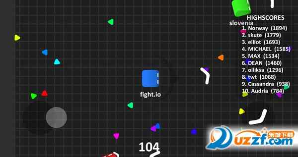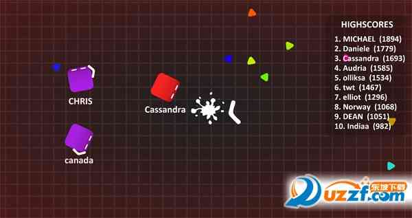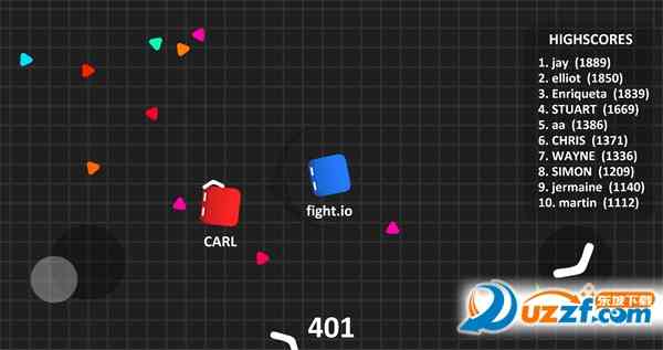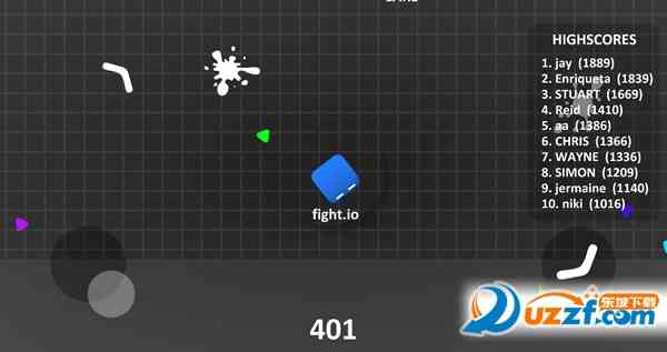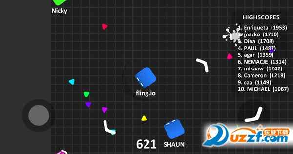 fling.io游戏中玩家在片非常大的地图当中操控一个小方块来发射回旋镖来攻击敌人,只要是被回旋镖射中了的敌人就会变成白色的液体摊在地上。游戏的玩法非常简单,和其他大作战类游戏都是一样的,使用虚拟摇杆来控制移动。尽量的多吃地图上面的小点,这些可以给你很多的分数,杀死其他敌人也会给你很高的分数。