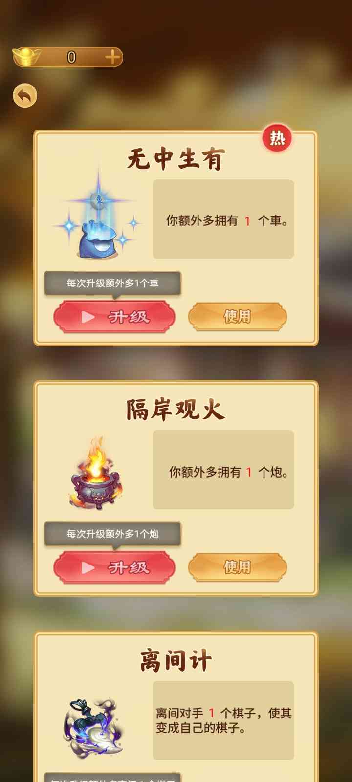 3、离间计 离间对手的棋子,使其变成自己的棋子,每次升级额外多离间一个棋子,人间清醒。
