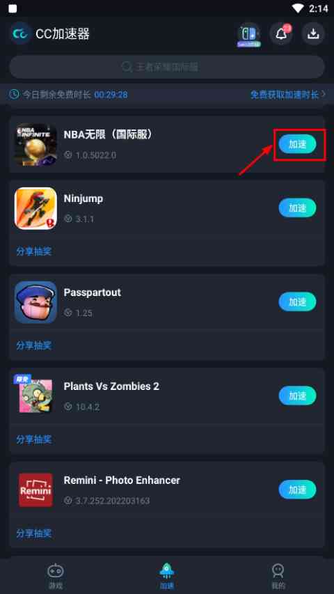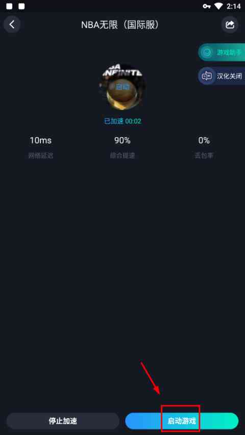 1、 在本站下载安装最强美职篮2国际服,然后打开加速器,点击右侧加速;