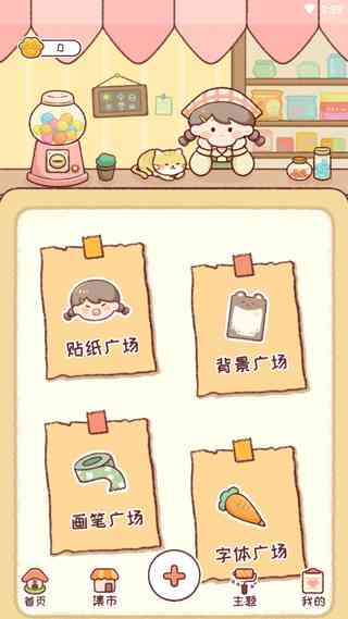 2、点击集市,这里有着很多实用工具,如贴纸、背景、画笔、字体等;