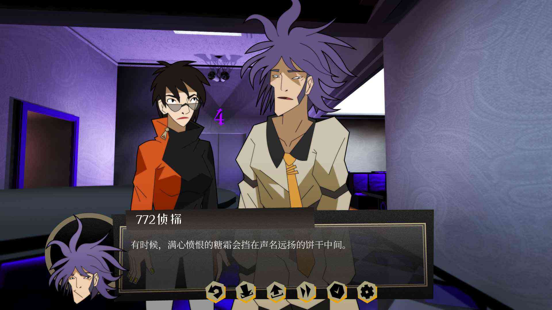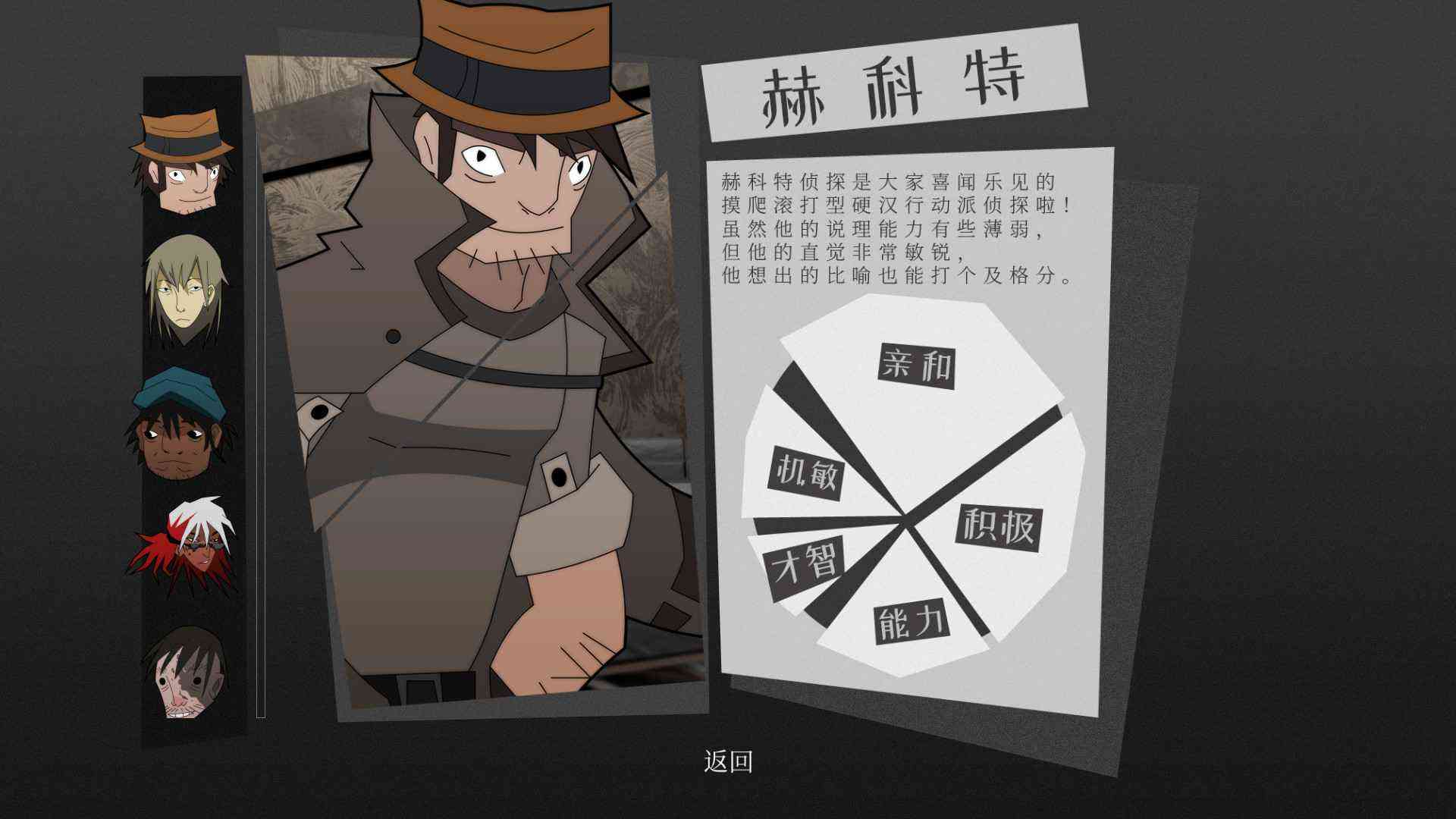 作为近期steam上移植的手游 这款游戏的画面还是比较贴近现在的潮流的,虽然说没有那种二次元游戏的做的那么细致入微,生动活泼,但在卡通+手绘风的画法加持下本来只是一些贴图加文字说明的小体量游戏,也在给人沉浸感方面的体验带来比较深入的感受。古灵精怪的角色设定, 杀马特的各种人物立绘,让本就应该严肃的侦探游戏融入了不少搞怪的氛围,介于写实和卡通的场景风格,类3d的贴图手法,却让人在心理上有着临场感爆棚的代入体验。所以游戏虽然在画面上不会有那么多光污染的视觉体验,却在游戏氛围上有着比较高的契合度,这家伙...。