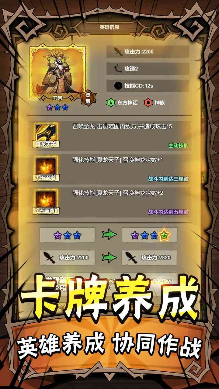 勇者干仗是一款竖屏塔防类游戏, 战斗和最强堡垒、正中靶心有几分接近,融合了自走棋的合成方式,再加上开位置和升级的资源统筹,以及羁绊组合玩法与卡组配置,可搭配空间很大,整体策略性很好那个。战斗全程自动, 手动控制合成与开位置即可,提前出怪也可以获得一些资源,手疾眼快可以获得更多,局内操作方面的设计也不错,火候不够。。