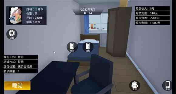 模拟人生经营游戏《牛马简易模拟器》, 对于普通社畜当牛做马人生的简单模拟,是很经典的模拟类游戏,相当于模拟人生。其中每个工作都有自己的上下班时间, 别纠结... 每天最晚23点睡觉,可以合理安排时间甚至打多份工增加收入。日常消耗包括吃住两方面没有对衣着方面做太细致模拟,走路一般靠跑。