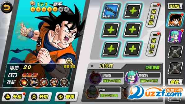 1、 游戏的绘画还是非常好的,可以看到我们的小悟空,和队伍里面的超级赛亚人悟空都和我们看的动漫里面的角色绘画一模一样,这样玩起来就很有感觉;,呃...