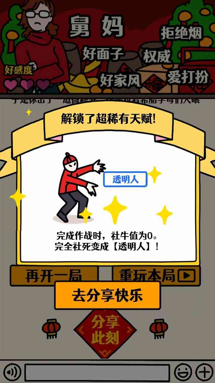 本来以为是怼亲戚模拟器抱着爽一把的心态玩了几局没想到意外地温馨, 并不全是脸谱化的尖酸刻薄亲戚,就是身边常见的那种有各种各样毛病但本质心肠不坏的类型,感觉到制作组的用心了而且鸭鸭和龙王上门送祝福好可爱啊我也想抱鸭鸭!再说说祝看到这条评论的大家新年快乐,万事胜意~,要我说...