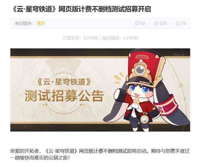 容我插一句... 米哈游宣布《云・星穹铁道》网页版计费不删档测试即将启动, 现已开启测试招募,目前仍处于开发阶段,测试内容及体验不代表到头来品质。