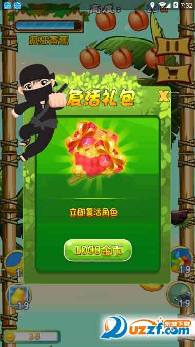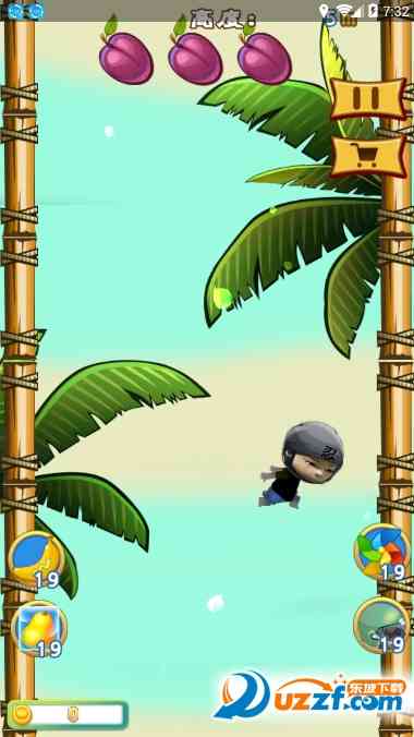 收集2个香蕉获得双倍金币,免疫死亡伤害道具,2个梨子可冻结时间减缓移动速度,2个风车获得无敌并快速向上移动,整起来。