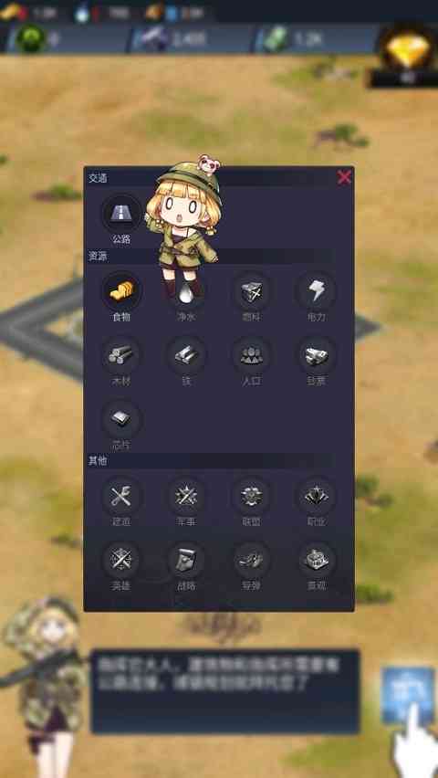 2、 点击左侧的“建造”功能,这里有许多设施可建造,交通包括公路,资源包括食物、净水、燃料、电力、木材、铁、人口以及芯片等。
