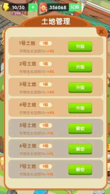 2、卡通的游戏场景,不同的种植挑战,看着这些农作物快速养成,干就完了!。
