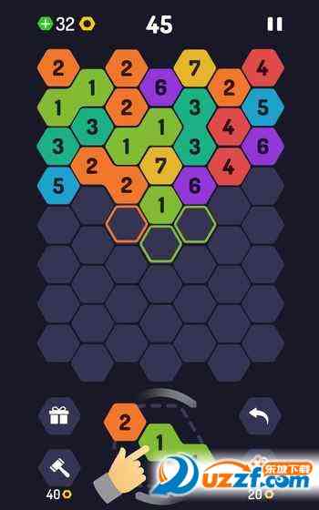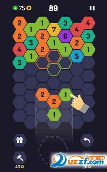 只需在蜂窝状的网格上, 将标有数字的六边形向上滑动,堆叠相同的数字将它们合并, 打脸。 让数字一直增加到9。堆叠板块时要好好动脑。网格可能很容易就会被填满哦。