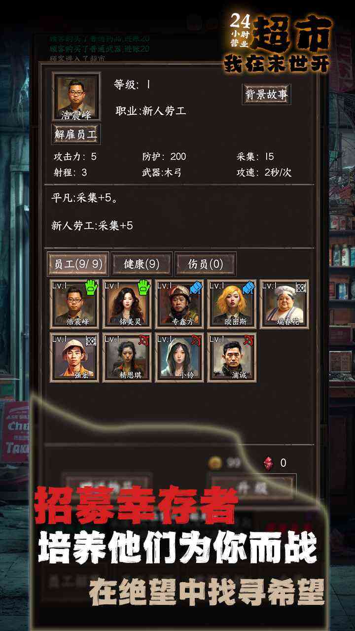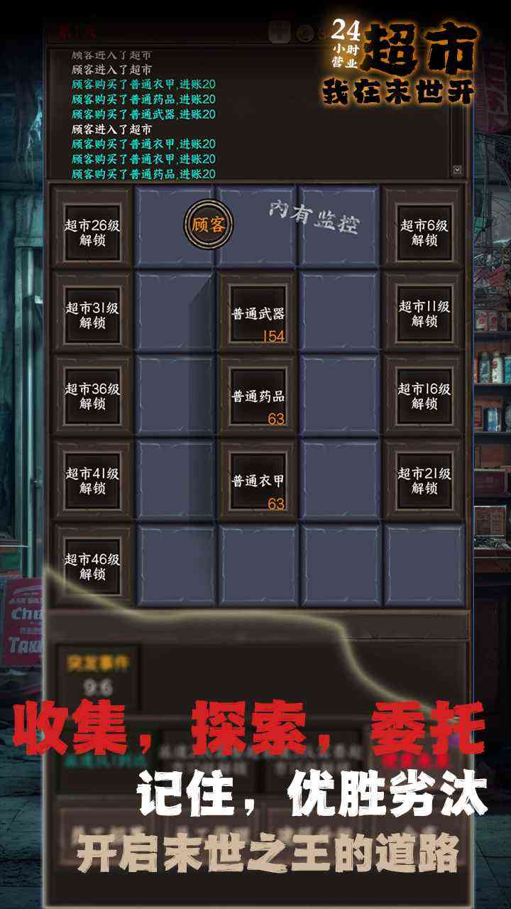 从3202年的那个雨夜接到 132天20时32分54秒, 这是我经营超市最长的生存时间,其实我并不知道的坚持的意义,只是有个声音时常在耳边回荡“加油,一定要坚持住。”。每一次的重来都让我更加疲惫,但希望的光也更加明亮。 我缓缓的从超市收银台后伸起懒腰, 长时间的战斗太让人疲惫,这种孤独陌生的感觉像深渊一点点蚕食我清醒的理智。 前几日冷清的超市中有了新面孔的顾客,这是之前都不成有过的。我高兴的看着他们,听着来自更远的乡音,时间好像回到了坐在父亲自行车后座的时光。这思绪顿时让我好受了些许。 我是深有体会。 一整个温暖的午后让人觉得末世好像从未到来。打开超市的门,门外是我喜欢的破旧躺椅。虽有阳光,但那些光照不到的地方,依旧是一片荒凉。 我还在努力寻找答案,你呢? 游戏介绍 《我在末世开超市》是一款以末世剧情结合轻度养成、 塔防和肉鸽元素相结合的游戏,您在游戏中是一位身处末世的超市老板,白天需要经营超市获取材料,升级超市、招募不同职业的幸存者、探索未知领域,夜晚您需要与幸存者共同抵抗从深海中出现的“感染者” 委托收集探索、 这也行? 末世生存求生、超市合作共存、优劣生死抉择,您将如何选择,就这?? 玩法规则 生存法则一:努力拯救更多的幸存者, 主要原因是在末世没有一个强大团队,就无法在末世生存下去; 生存法则二:不能低估如何一只丧尸,也不要高估自己的实力, 图啥呢? 主要原因是不这样做的人已经是地上的炮灰; 生存法则三:野外探索对一切未知保持警惕,强烈的好奇心是大部分炮灰都有的心理; 生存法则四:不可轻信其他团队,天下没有免费的午餐,免费的信息往往三真七假,在行善的一边,戒备暗中的恶; 生存法则五:守护好这间“超市”,它将是我们所有的希望; 生存法则六:请绝对相信二掌柜言语,主要原因是二掌柜为人憨厚、正义、绝不撒谎; 生存法则七:请绝对相信二道贩子商品与消息,主要原因是二道贩子必出精品,品格高尚不屑说谎; 生存法则八:…… 我在末世开超市火爆了 主要原因是加载人数过多,服务器的问题。 部分玩家无法进入,或者是进入过慢; 请大家耐心等待官方修复。