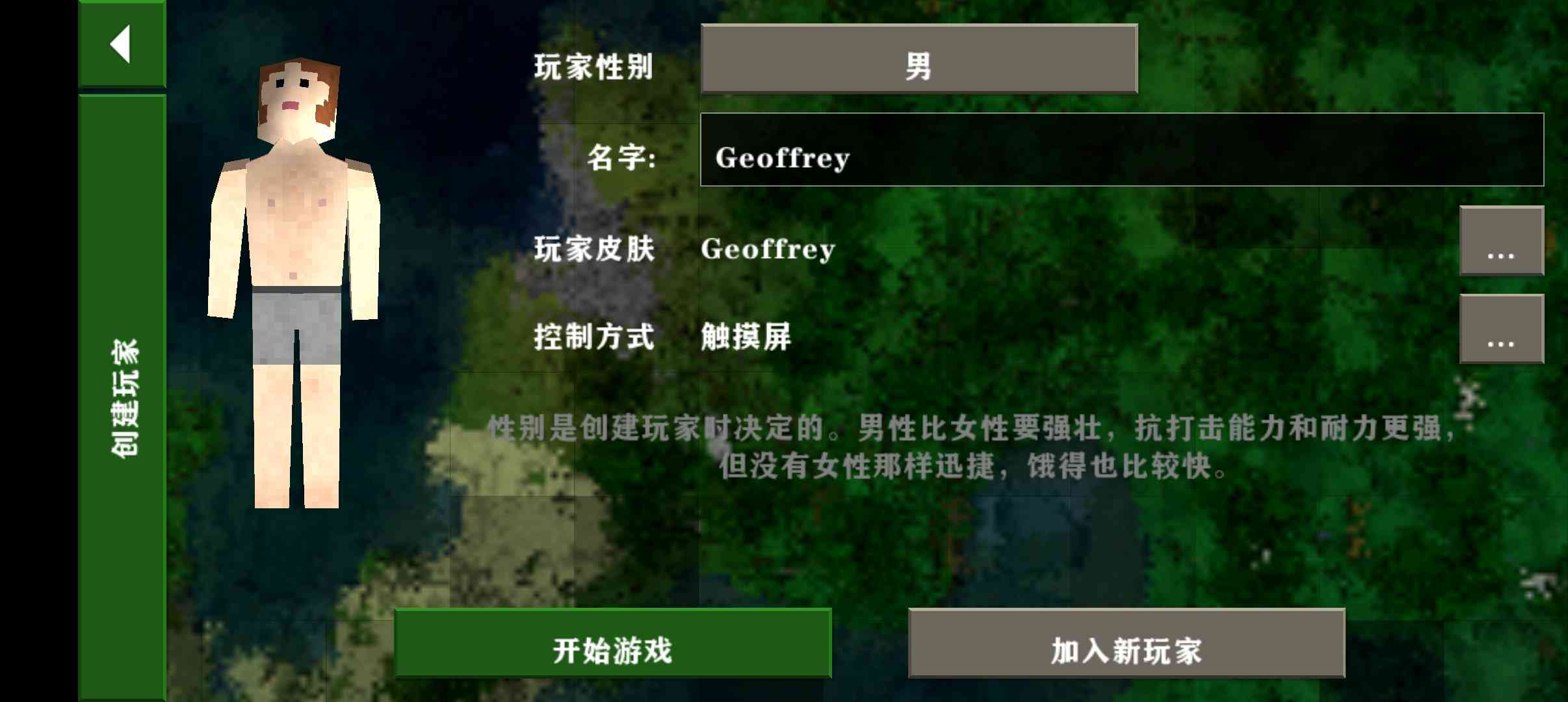 3、 之后就是创建角色,可以选择性别、名字以及修改皮肤和控制方式等, 我可是吃过亏的。 创建完后即可开始游戏。