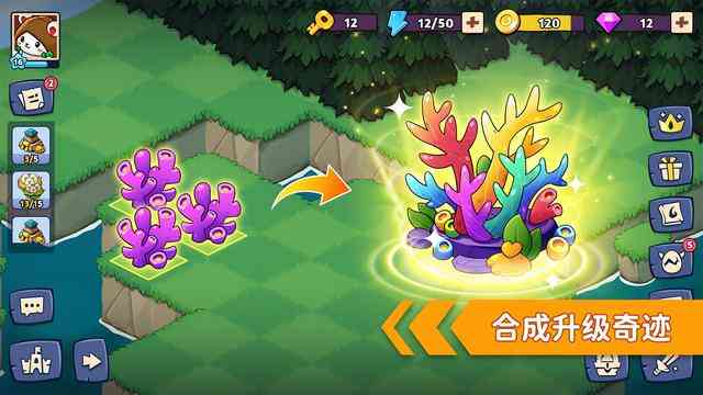 拖动相同物品合成, 一秒即可进化;合成豆豆获得伙伴之力,可开垦更多土地;合成高产遗迹享受在线报恩,点击就有一波奖励尽情收割,算是吧...!