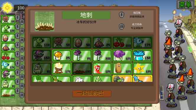 6. 在游戏正式开始前,你需要选择八种植物。 捡漏。 选择完毕后点击“一起摇滚吧!”即可开始游戏。