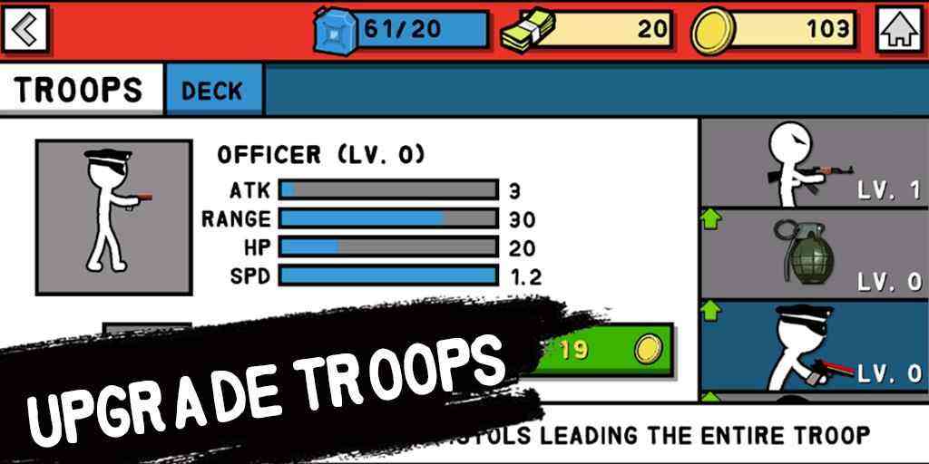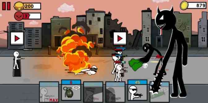 攀上新的台阶,以解锁令人兴奋的传统部队和军事装备。您可以使用火柴人队长, 火柴人士兵,大炮,掩体,火柴人狙击手, 我无法认同... 火柴人机枪手,卡车,火箭筒,矿山,烟雾,坦克等等。目标是与您所有的火柴人部队一起穿越战场。