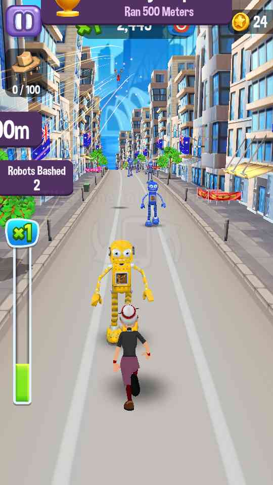 面对这么多障碍, 老奶奶依旧奋勇向前,真可谓人老心不老,小编也深深的被她的精神所感染!玩家要注意搜集街道上的金币,而且街道上的路人不需要避开,当老奶奶靠近后将会飞起一脚将其踢飞,而且是连续飞踢啊,在屏幕的左方有一个能量槽,蓄满后可以获得分数加成,踢飞一个路人可以获得2个金币,踢飞路人和吃到金币都可以为能量槽蓄力,我傻了。。