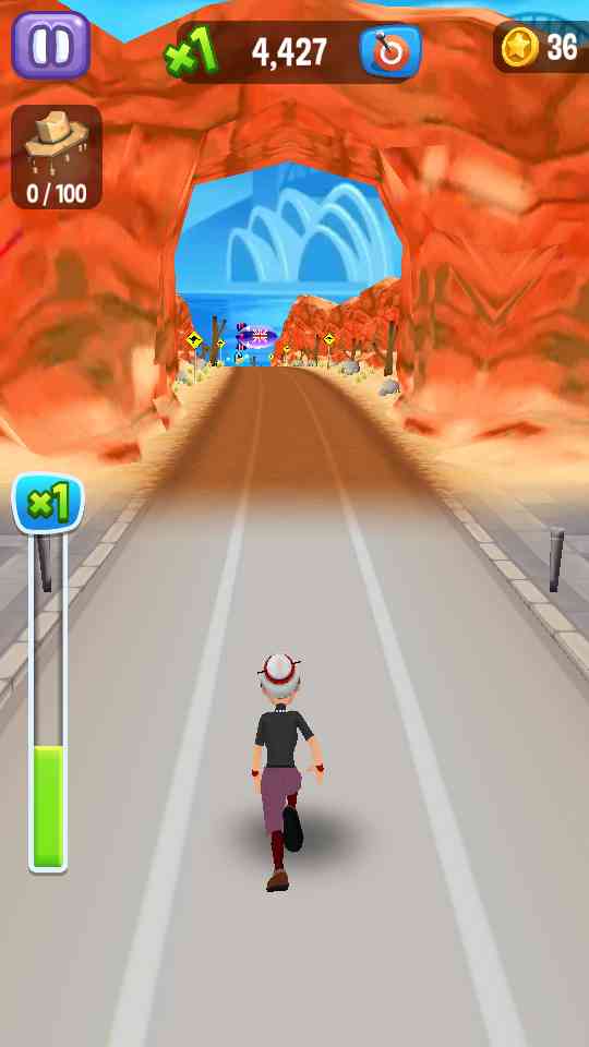 差不多得了... 点击Play即可开始游戏, 你会看到一个满头白发,一身朴素的衣衫,看似弱不禁风的老奶奶伴随一团烟雾从精神病院中破门而出,拼命地狂奔。游戏操作上与传统神庙式跑酷在操作上大同小异, 通过重力感应来控制人物的跑动偏向,用手指的上下左右划动来控制跳跃下滑左右转向等。在游戏中玩家操控的老奶奶将会面对重重障碍:路障, 超大易拉罐,UFO,大鱼,恐龙,路人,横穿马路的汽车,被工人抬着的玻璃,飞艇,晒衣服架等等,特别要注意的是横穿马路的汽车和玻璃会临时出现,需要玩家快速的反应去闪躲。