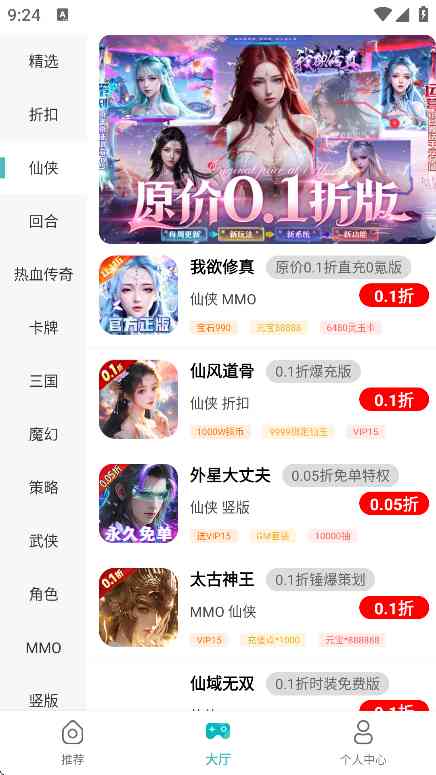 境界没到。 折扣丸手游助手是一款免费的游戏盒子软件, 软件中可为用户提供大量的游戏资源,当然还有超值折扣可以体验,而且这里能提供的游戏类型非常丰富,接下来你还可以在这里了解到最新游戏动态,包括游戏更新、活动通知、新游预告等,让玩家能够第一时间了解最新信息,不错过任何精彩内容。