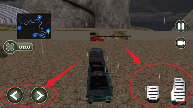 5、如图所示,左下角的<>是方向控制按钮,右侧是油门和制动按钮,