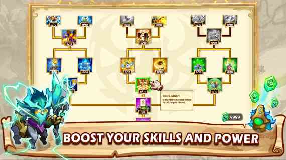 英雄、防御塔、法术都有各自的天赋树。优先升级对战斗影响大的天赋,