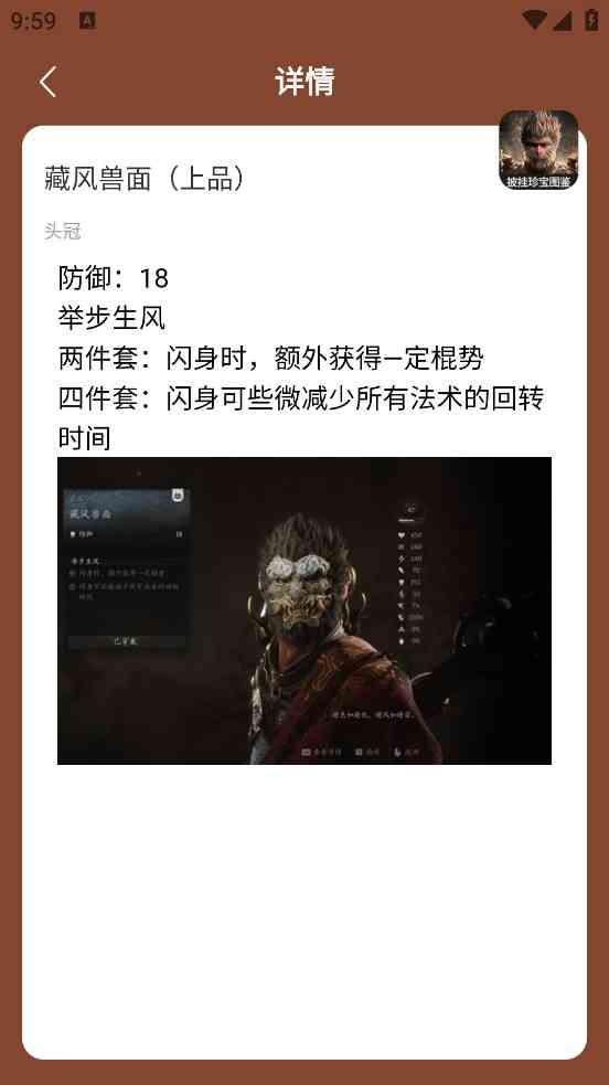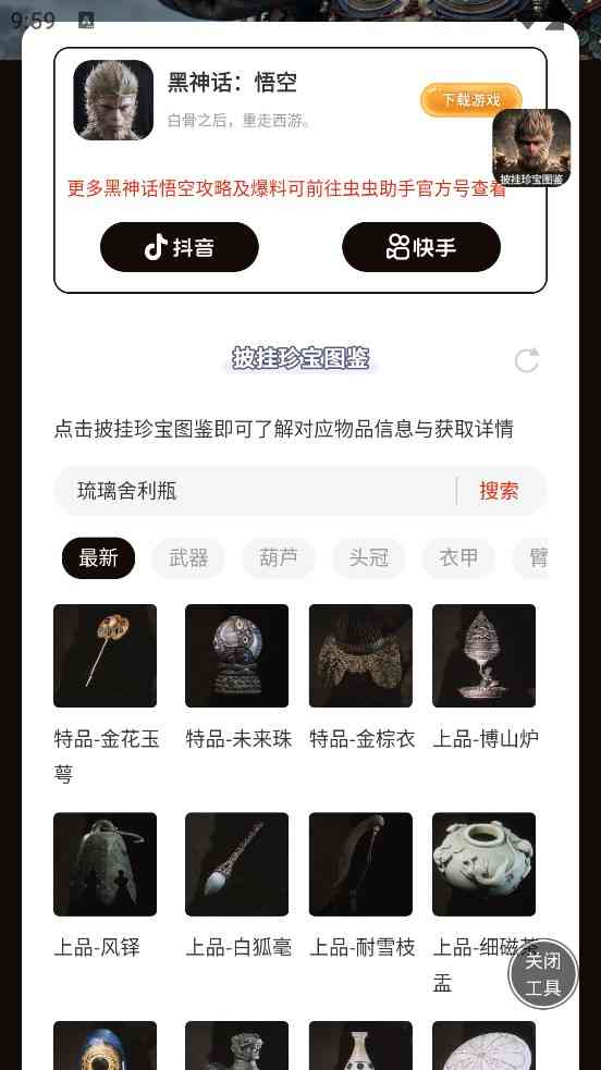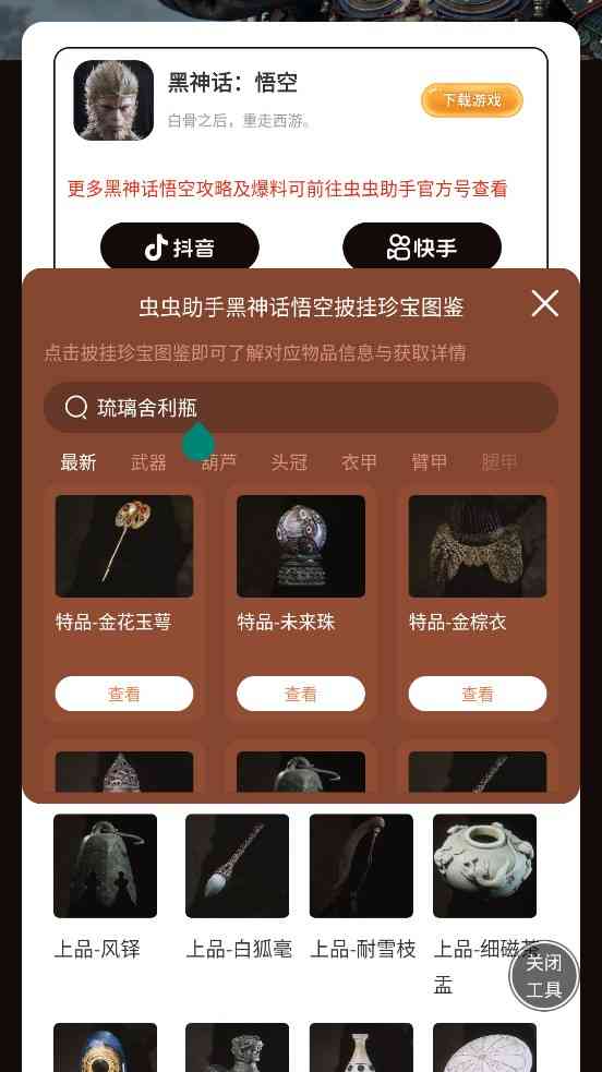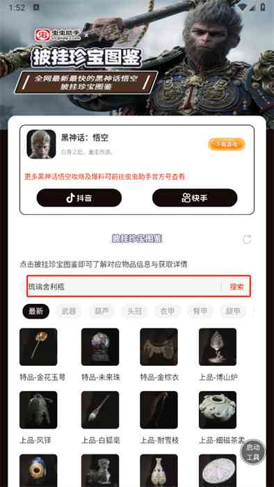调整一下。 黑神话悟空披挂珍宝图鉴是一款游戏辅助软件,它将详细展示黑神话悟空游戏中的各种披挂珍宝指南。玩家可以使用这些指南来详细了解每个宝藏的具体用途、名称以及如何获取它。一边,玩家还可以通过软件搜索所需的攻略,快速解决游戏遇到的问题。
