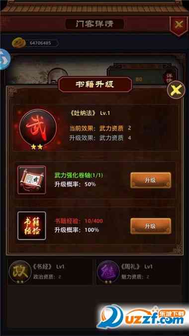 我裂开了。 资质提升会大量增加对应属性的数值, 所以到后期这才是提升势力最快的途径之一,当然也是最贵的。这里的建议是强化卷轴用在高属性门客身上, 如果没有得到高属性门客最好先存着不要用,主要原因是无氪的话强化卷轴是很稀有的。特别是武力卷轴, 建议最好针对一位高属性门客强化,四星性价比相对最高,五星六星失败率高了不划算,还不如用书籍经验一步步堆上去。
