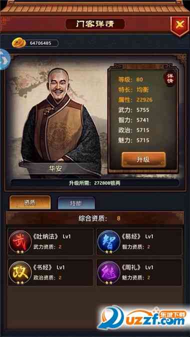 一、 游戏属性为武力、智力、政治、魅力,四项属性的综合加起来就是玩家的势力值,这些属性主要通过强化门客来增加, 啊这... 智力影响每次征收到的钱财数额,政治影响收到的粮食,魅力影响招兵人数,武力影响你过关卡以及PK以及打副本的数值