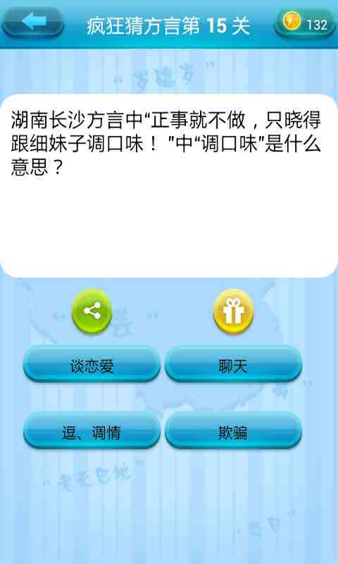 《疯狂猜》是一款益智解谜类游戏,玩家需要根据提示来猜出对应的。游戏网罗全国23个省的多种特色。疯狂的答案,按照不同的地区进行分类汇总,玩家可以查找需要的答案。