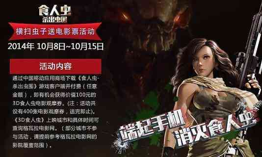 下载并登录游戏,消费任意金额即有机会获得《3D食人虫》电影观摩券,抓到重点了。。