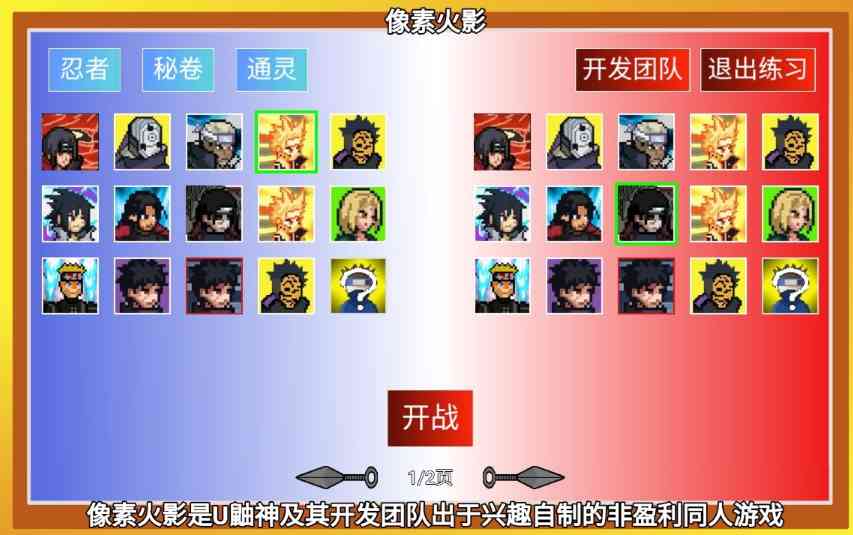 像素火影luogai是玩家自制火影同人游戏。刚进入游戏的UI界面就足以说明了一切, 简简单单的“开始游戏”、“对战练习”、“退出游戏”功能,然后背景整个无动态贴图, 从一个旁观者的角度看... 确实是有够简化的。虽然是像素风格, 但是《像素火影》对于人物的细节表现并不弱,从人物的服饰到动作的联动性,都不难看出至少在人物展现这块的动态做得还是蛮好的。