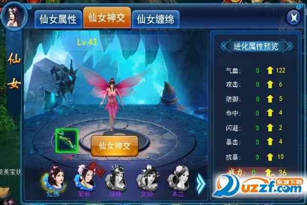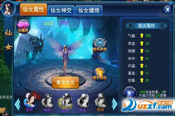 在仙女属性界面上可查看仙女形象,及其对应属性和技能,仙女可提升等级,等级达到40级后可提升仙女资质。