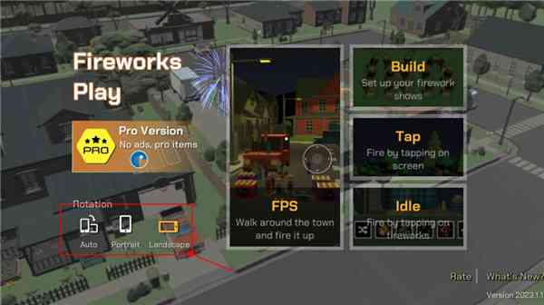 太刺激了。 1、 打开游戏该界面后点击这里可以切换游戏的横屏与竖屏模式,以不同角度去欣赏烟花