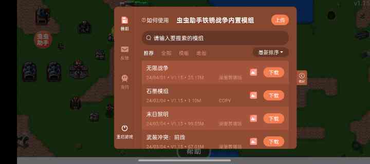 内卷... 2、 来到游戏首页之后我们点击左侧的悬浮窗口,会弹出模组下载界面这里的每一个模组都可以直接下载。