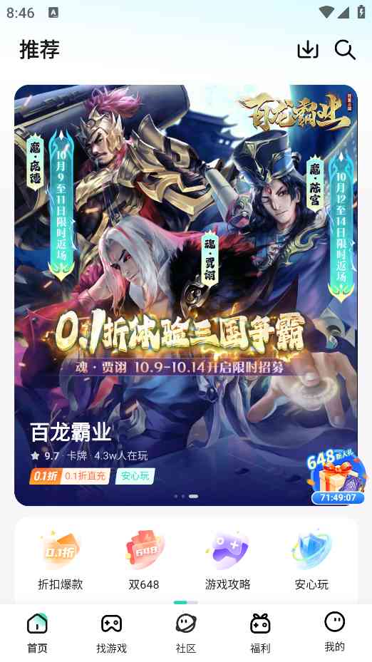2、进入到首页,这里提供了丰富的折扣爆款游戏资源,以及游戏攻略。