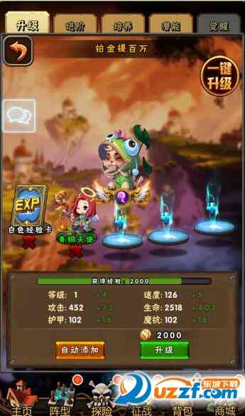 卡牌的等级提升需要在卡牌的“升级”界面消耗大量经验卡,升级时对速度、攻击、生命、护甲、魔抗五项属性进行提升。